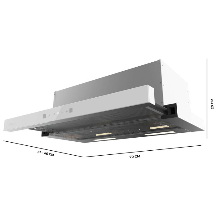 La campana convencional Cecotec Bolero Flux TLT 704400 Glass White está diseñada para ofrecer una extracción eficiente y de bajo consumo en cocinas domésticas, combinando un cuidado diseño con un alto rendimiento. Con un ancho de 70 cm, presenta un acabado elegante con cuerpo en acero inoxidable y frontal de cristal blanco, lo que facilita la limpieza y permite integrarla con discreción en cocinas modernas de color claro. Su clasificación energética A+++ y el motor BLDC de última generación garantizan una extracción potente con un consumo eléctrico muy reducido, ideal para un uso frecuente. Ofrece hasta 431,2 m³/h de capacidad de succión, adecuada para mantener la cocina libre de humos, olores y grasas en un uso diario normal, y dispone de varias velocidades de funcionamiento más función Booster, que incrementa puntualmente la potencia cuando se cocina a alta intensidad. El panel de control táctil invisible queda oculto cuando la campana está apagada, favoreciendo una estética limpia, y se complementa con la función Hand Movement Control, que permite cambiar la velocidad de extracción con un simple gesto de la mano sin tocar la superficie. Incorpora iluminación LED de bajo consumo para una visibilidad óptima de la zona de cocción, y trabaja con un nivel sonoro aproximado de 62 dB, acorde con campanas domésticas de esta categoría. Sus filtros de aluminio de varias capas son lavables e incluso aptos para lavavajillas, lo que simplifica el mantenimiento y ayuda a mantener un buen rendimiento de aspiración. La campana puede funcionar con salida de humos al exterior o en modo recirculación gracias a los filtros de carbono incluidos (no instalados), lo que resulta útil en cocinas donde no es posible realizar una salida directa. Su instalación libre, alimentación mediante red eléctrica 220 V y potencia de 56 W completan un conjunto equilibrado en prestaciones, consumo y facilidad de uso. En resumen, esta campana extractora Cecotec se presenta como una solución eficiente y bien equipada para renovar la extracción de aire en la cocina con un diseño moderno y funcional.