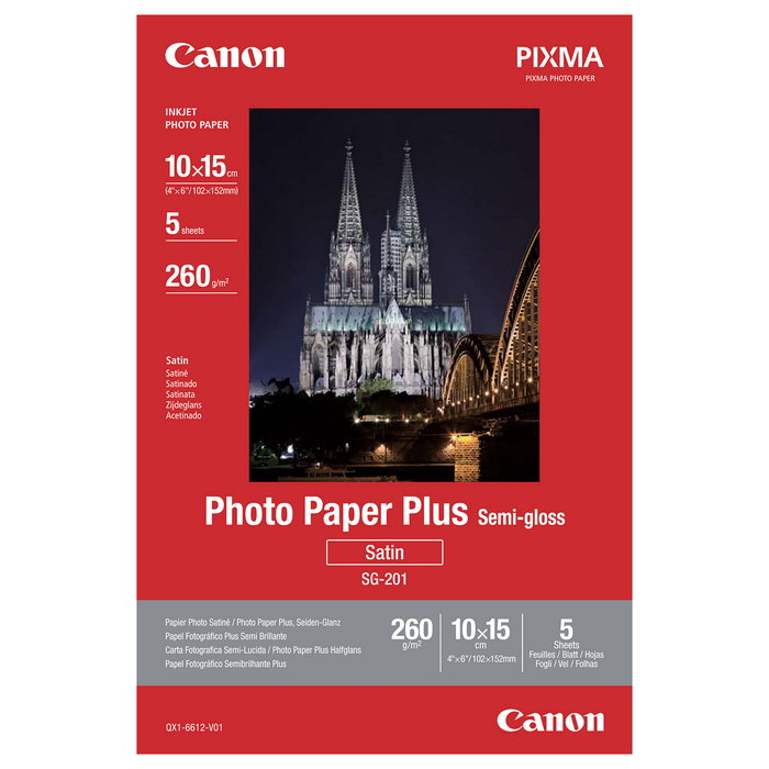 Canon SG-201 Fotopapier Plus Papel Fotográfico Seidenglanz Acabado Satinado 100x150mm 260 g/m² Paquete 5 Hojas