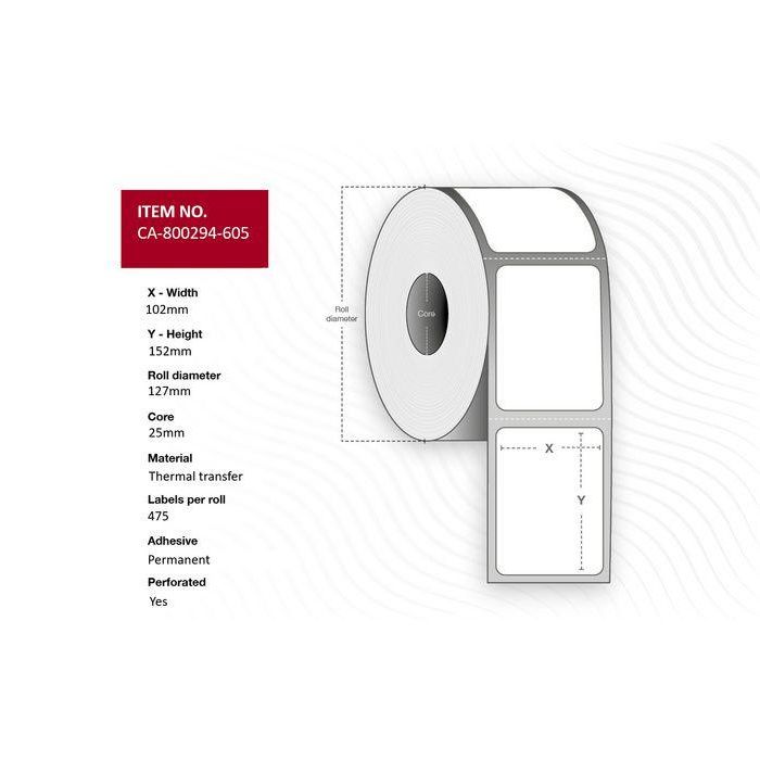 Capture 800294-605 Etiquetas Transferencia Térmica 102 x 152 mm, Núcleo 25 mm, Permanente, Perforada, 475 etiquetas/rollo, 12 rollos