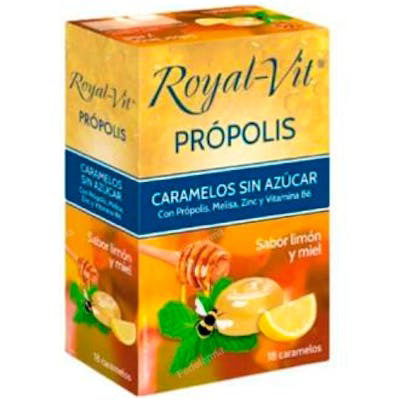 Indicaciones: Royal-Vit caramelos sin azúcares, con edulcorantes. Con própolis, melisa y aromas de limón y miel. Contiene Zinc y vitamina B6, que contribuyen al funcionamiento normal del sistema inmunitario. La Melisa es conocida por su acción calmante.