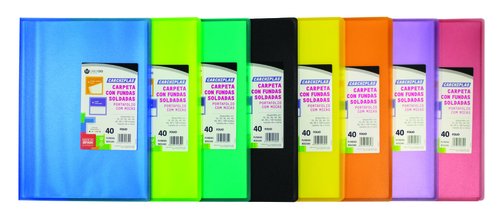 Carpeta de fundas soldadas Carchiplas book con tapas de polipropileno semirígido de color, soldadura reforzada y fundas de polipropileno piel de naranja calidad extra. Medidas: 330 x 245 mm.