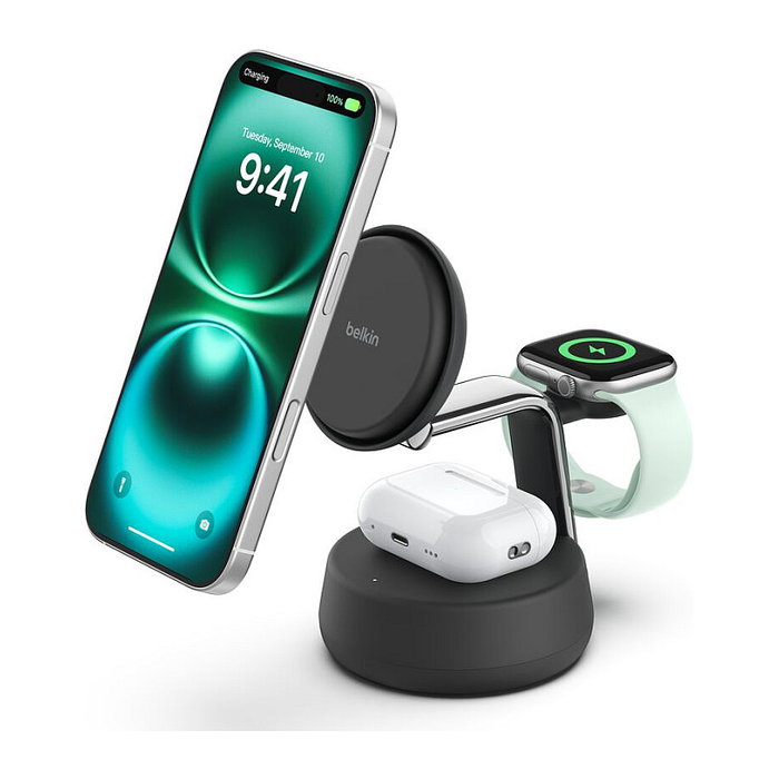Belkin UltraCharge Pro WIZ040kqCH - Cargador 3 en 1 inalambrico Qi2 MagSafe 25W, Negro, con cable USB-C 1.5 m, para iPhone, AirPods, Apple Watch y mas dispositivos compatibles