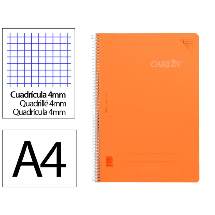Carlin Cuaderno Espiral A4 Tapa Plástico 80 Hojas Cuadro 4mm Con Margen Color Naranja 90gr