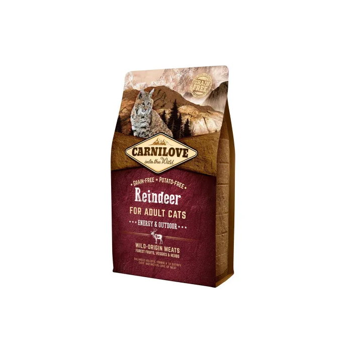 Alimento completo para gatos adultos de Carnilove, formulado con carne de reno. Diseñado para gatos activos y que pasan tiempo al aire libre, proporcionando la energía necesaria para un estilo de vida dinámico. Presentación de 6 kg.