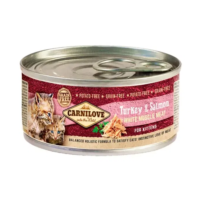 Carnilove Feline Kitten Pavo Salmon Caja 12x100 gr. Alimento húmedo premium para gatitos de la marca Carnilove, elaborado con pavo y salmón. Presentado en una caja que contiene 12 sobres individuales de 100 gramos cada uno, ideal para una alimentación equilibrada y deliciosa.
