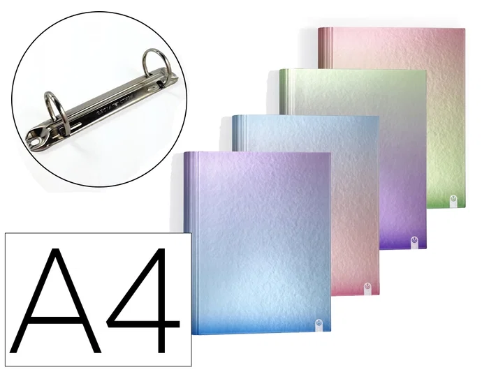 Carpeta de anillas de cartón forrado metalizado Gradient. Colores extra brillantes metalizados con acabado especial anti rayas. Con lomo curvo y apertura 360º. 4 anillas de 25 mm. Posibilidad de compra por color o en colores surtidos.