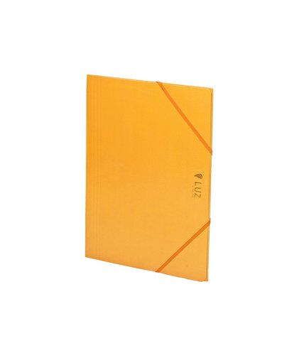 Carpeta de tres solapas y cierre de goma plana a juego, en cartón plastificado en colores brillantes.
