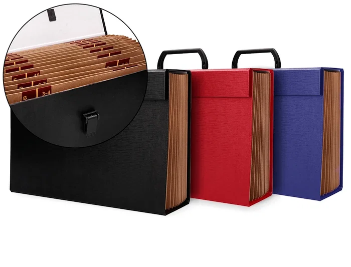 Maletín con apertura tipo acordeón. Con 19 departamentos y cerradura con broche. Fabricado en cartón forrado exterior de 2,5 mm. Departamentos interiores de 2,2 mm. Medidas: 390 x 255 x 120 mm. Colores surtidos: azul, negro y rojo.