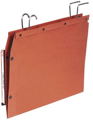 Fabricada en kraft naranja de 240 gramos. Ganchos de alambre. Lomo en V con visor de 150 mm. Medidas de la carpeta 250 x 350 mm.