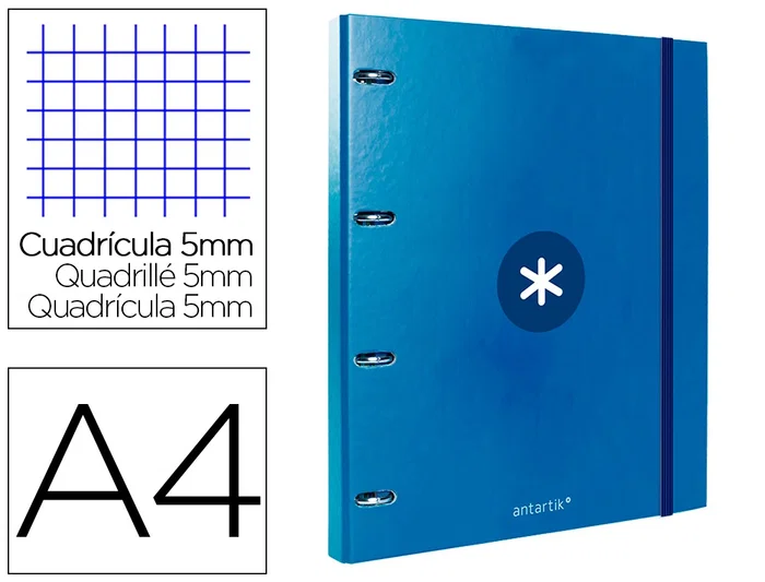 Tapa de cartón forrado de 1,75 mm de espesor. Forrada en papel estucado mate de 135 g/m² impreso. Plastificada mate con detalles barniz UVI. 4 anillas redondas. Cierre de gomilla. Con ranuras para anillas. 100 hojas con 5 bandas de color y 4 taladros. Papel interior extrablanco de 100 g/m². Ultrasuave. Cuadrícula de 5 mm. Formato DIN A4. Guarda interior impresa.