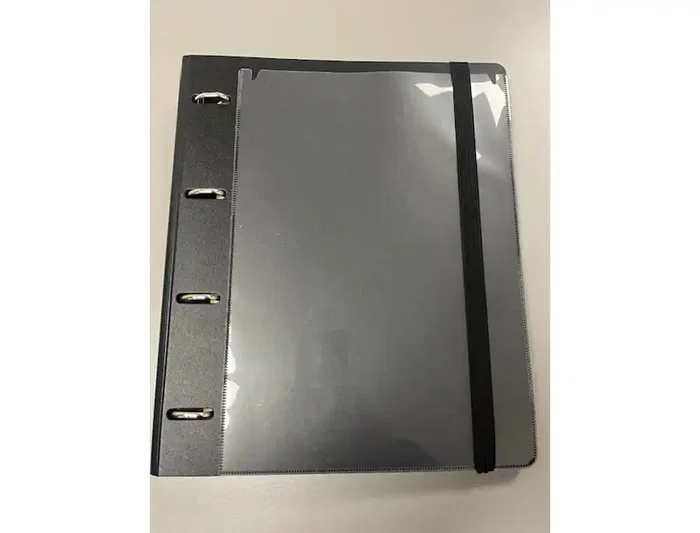 Carpeblock personalizable de pp foam color negro. Con 4 anillas de 35 mms. Con block de 120 hojas de 90 grs con borde colores. Con separador de 5 colores. Con cierre de gomas.