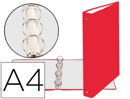 Carpeta fabricada en cartón forrado en polipropileno. 4 mm de grosor. Mecanismo de anillas redondas de 30 mm sin compresor. Ancho de lomo: 40 mm. Formato DIN A4. Medidas: 260 x 320 mm.