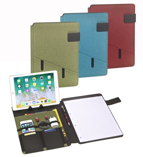 Carpeta para documentos en tamaño A4, con soporte atril para tablet, múltiples bolsillos, porta bolígrafo y cierre con trabilla de imán oculto. Además, trae un bloc de papel cuadriculado de 80 gramos con 4 taladros para tomar notas rápidas y tener todo a mano.
