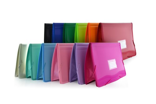 Carpeta Colorline en tamaño 340 x 250 mm con fuelle de gran capacidad (hasta 70 mm), refuerzo de tela en los bordes y cierre con gomas elásticas redondas. Todo fabricado en PP para dar una mayor protección a sus documentos.