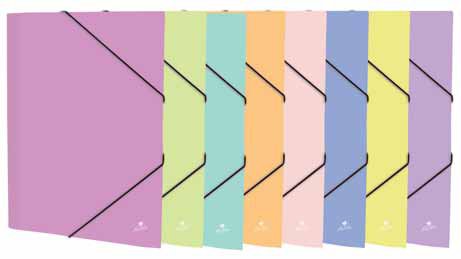 Carpeta de gomas y solapas fabricada en cartón forrado con papel plastificado mate, en colores pastel.