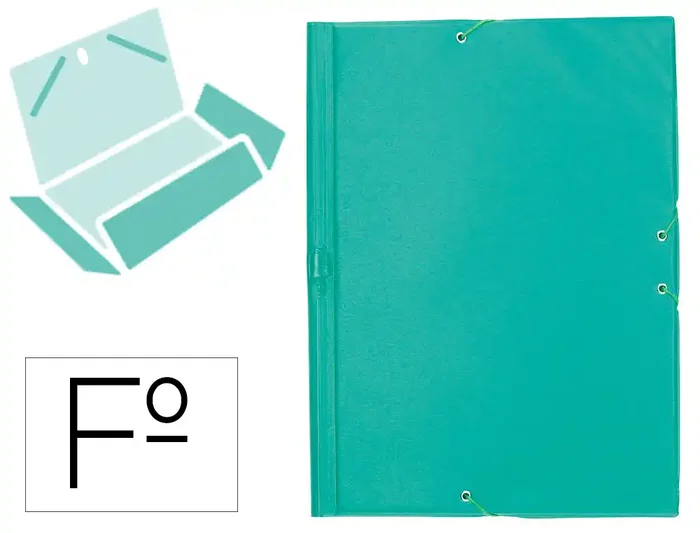 Carpeta fabricada en cartón forrado en plástico soldado. 3 mm de grosor. Colores brillantes y vivos. Cierre por gomas. Lomo flexible. Tres solapas. Tamaño folio.