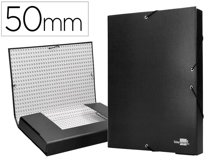 Carpeta para proyectos fabricada en cartón entrecolado de 1,9 mm de espesor, forrado gofrado tela de PVC y guarda interior. Con etiqueta identificativa para pegar en el lomo. Cierre con elástico. Tamaño folio. Medidas: 250 x 350 mm.