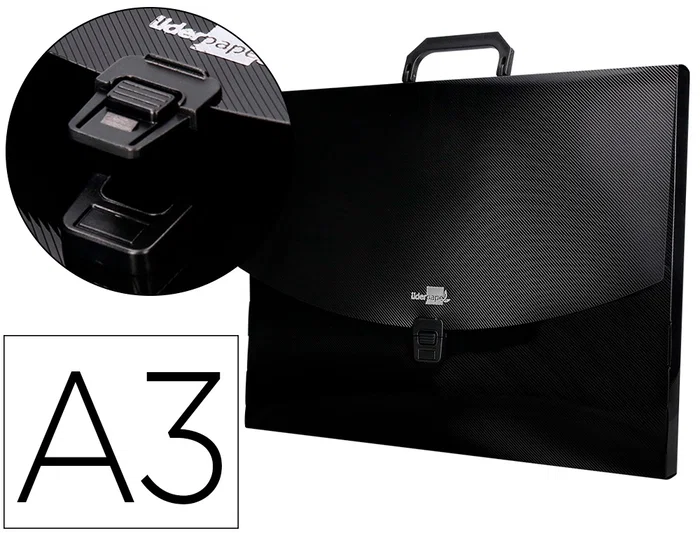 Fabricada en polipropileno. Con asas de plástico y broche. Ideal para dibujo y diseño gráfico. 1000 micras. Lomo de 35 mm. Color negro. Formato DIN A3.