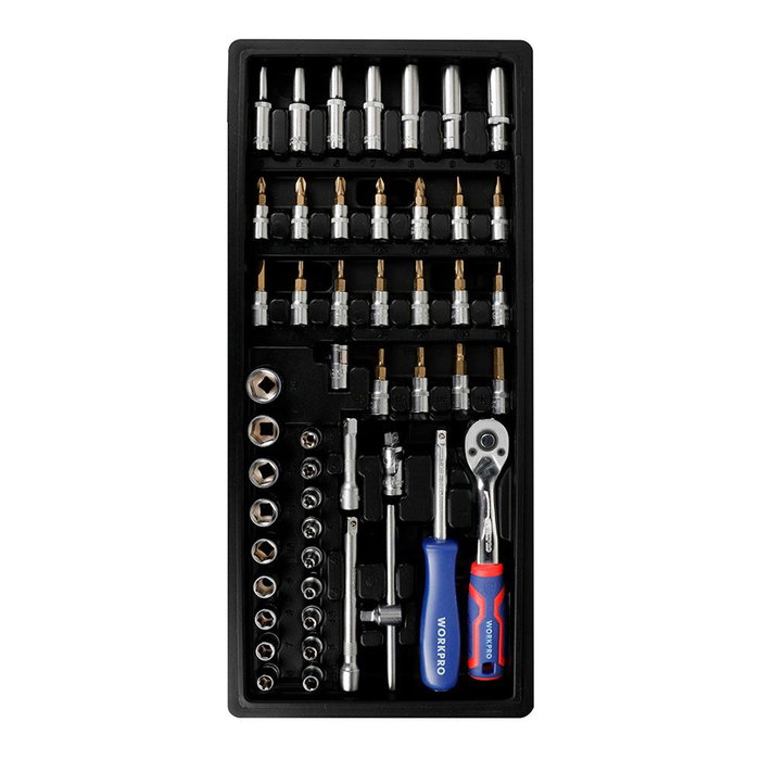 Juego carraca ¼ pulg, vasos y puntas, juego 50 piezas - contiene 1 llave de carraca de ¼ pulg 72 dientes - 13 vasos hexagonales 4, 4.5, 5, 5.5, 6, 7, 8, 9, 10, 11, 12, 13 y 14mm - 5 vasos torx externo 4, 5, 7 y 8mm - 18 vasos con punta: hexagonales h2, h3, h4, h5, h6 - torx t10, t15, t20, t25, t30 - plana sl4, sl5.5, sl7 - phillips ph1, ph2, ph3 - pozi pz1, pz2 - 7 vasos largos hexagonales 4, 5, 6, 7, 8, 9 y 10mm - 2 barras de extensión 50 y 100 mm - 1 mango destornillador giratorio 150 mm - 1 articulación universal - 1 barra en t deslizante - 1 adaptador de puntas