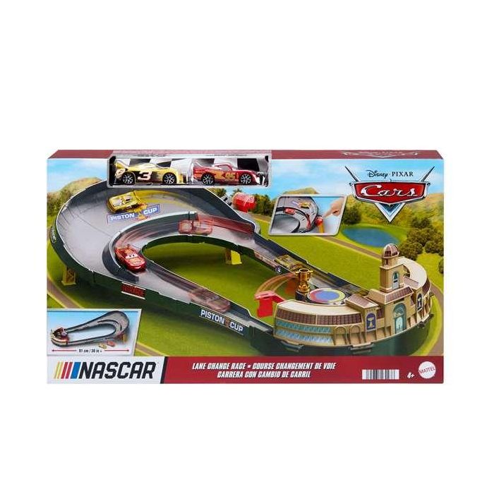 Mattel Cars Pista Nascar Hxj33 Disney Pixar, Conjunto de Carreras con Cambio de Carril y 2 Coches Incluidos Rayo McQueen y Carstin Dillon