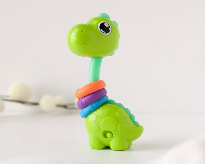 El mordedor de dinosaurio multicolor kiokids es el juguete perfecto para los primeros meses de tu bebé. con su variedad de colores brillantes y texturas, estimula los sentidos y ayuda en el desarrollo cognitivo temprano. su forma de cuello largo permite que los bebés lo agarren y lo muevan con facilidad, mientras que el sonido suave del sonajero ofrece una experiencia auditiva calmante. su cabeza gira 360º y tiene varias melodías. la dentición suele comenzar entre los 4 y los 7 meses y puede ser una época frustrante tanto para el bebé como para los padres. puede que el niño babee más y quiera morder objetos, y seguramente resultará molesto y el niño estará más irritable. para aliviar estos síntomas, debemos dar al bebé algo para morder. para ello contamos con una completa colección de mordedores en plástico, muy fáciles de sujetar, con diferentes colores y texturas para masajear las encías, y mejorar los síntomas de la dentición de tu bebé. fabricado con materiales seguros y no tóxicos, es el juguete ideal para la diversión del bebé. - recomendado para +3 meses. - funciona con pilas 3x ag13- lr44- 1,5v (incluidas) - con melodías. - cabeza giratoria 360º - material: plástico. - medidas: 15 x 6 cm.