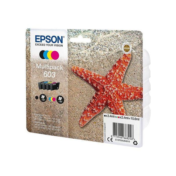 Disfruta de copias fiables, nÃtidas y de colores vivos con una inversión mÃnima gracias a la tinta 603 de cuatro colores de Epson. Con la combinación de tintas negras pigmentadas y de colores de tipo colorante, este pack de tintas crea copias definidas y llenas de color.