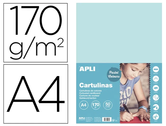 Cartulina azul claro de 170 g/m² tamaño A4. Cada pack contiene 50 cartulinas.ideales para todo tipo de manualidades, lettering, scrapbooking, cubiertas, separadores, papiroflexia, impresión de documentos? gracias al tintado en masa, las cartulinas apli ofrecen unos colores más homogéneos y nítidos, libres de imperfecciones. Aptas para uso escolar, ya que están libres de ácidos. Además, dentro de la amplia gama de cartulinas apli podrás encontrar todos los colores que necesites.