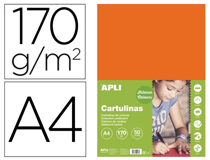 Cartulina naranja de 170 g/m² tamaño A4. Cada pack contiene 50 cartulinas.ideales para todo tipo de manualidades, lettering, scrapbooking, cubiertas, separadores, papiroflexia, impresión de documentos? gracias al tintado en masa, las cartulinas apli ofrecen unos colores más homogéneos y nítidos, libres de imperfecciones. Aptas para uso escolar, ya que están libres de ácidos. Además, dentro de la amplia gama de cartulinas apli podrás encontrar todos los colores que necesites.
