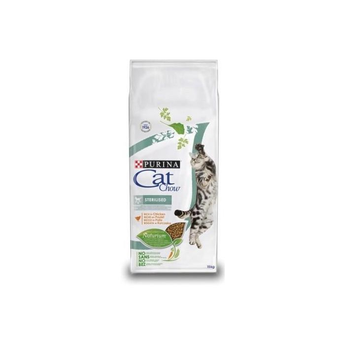 - La fórmula PURINA® CAT CHOW® NaturiumTM es una combinación específica de fibras de fuentes naturales. Incluye una fuente natural de prebióticos que se ha demostrado que mejora el equilibrio de la microflora intestinal y favorece el mantenimiento de la función digestiva de tu gato, para que pueda sacar el máximo partido a su alimento. La fórmula PURINA® CAT CHOW® NaturiumTM es una combinación específica de fibras de fuentes naturales. Incluye una fuente natural de prebióticos que se ha demostrado que mejora el equilibrio de la microflora intestinal y favorece el mantenimiento de la función digestiva de tu gato, para que pueda sacar el máximo partido a su alimento. Especialmente formulado para ayudar a contrarrestar el impacto de los cambios hormonales relacionados con la esterilización. Con niveles adaptados de proteína y grasa para ayudar a mantener unos músculos fuertes y un peso saludable.