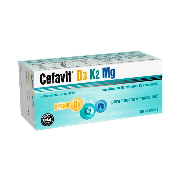 CEFAK D3-K2-Mg 60 Cápsulas. Complemento alimenticio con Vitamina D3, K2 y Magnesio para huesos y músculos.