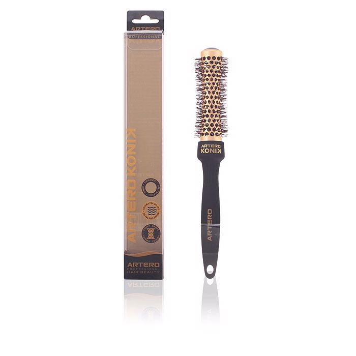 Cepillo para el cabello Artero de 53 mm. Este cepillo cerámico e iónico es la solución perfecta para eliminar el encrespamiento y añadir un brillo deslumbrante a tu cabello. Su diseño cónico permite un peinado más eficiente, y sus púas de nylon facilitan el desenredo sin dañar la fibra capilar. Además, su forma ergonómica garantiza un manejo cómodo y práctico, haciéndolo ideal para el uso diario.
