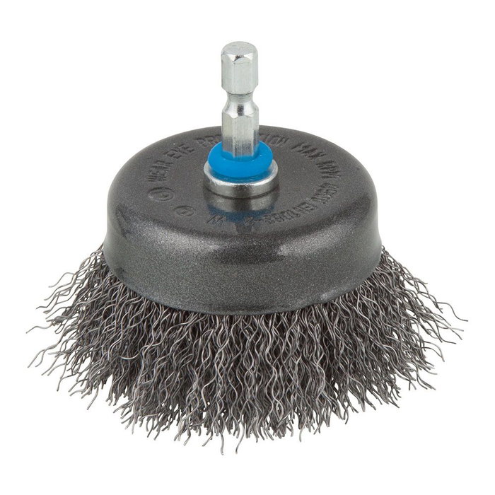 Cepillo de copa de alambre de acero - diámetro de trabajo: ø75 mm - longitud del alambre: 25 mm - versión de vástago: vástago hexagonal de 6,35 mm, 1/4 pulg - dimensiones: 75 x 75 x 65mm