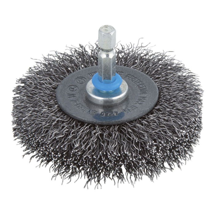 Cepillo de disco de alambre de acero ø75 x 16 mm - longitud del alambre 17 mm - vástago hexagonal de 6,35 mm - ¼ pulg, longitud de vástago 27 mm, 4500 rpm