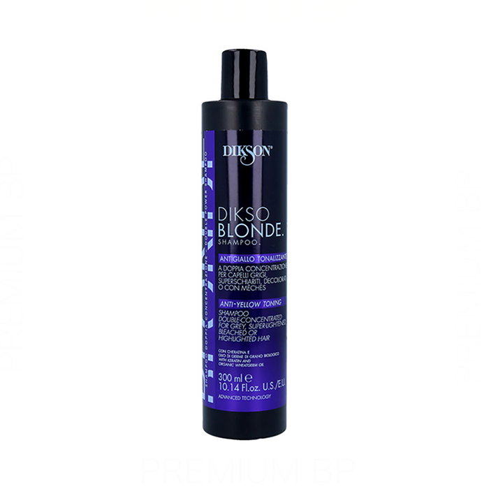 Dikson Dikso Blonde Champú Anti Amarillo es un champú profesional formulado para neutralizar los reflejos amarillos no deseados en cabellos rubios decolorados con mechas o grises.