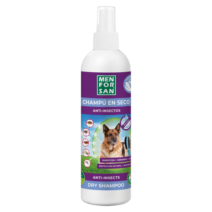 - Observaciones: Champú en seco en formato spray natural para perros con MARGOSA, GERANIOL y LAVANDINO. La MARGOSA (NEEM) es un insecticida natural que elimina todo tipo de insectos presentes en la piel o el pelaje (pulgas, garrapatas, chinches, ácaros). El GERANIOL y el LAVANDINO, repelentes naturales, proporcionan una protección adicional repeliendo todo tipo de insectos voladores (moscas, tábanos, avispas). Este producto está testado científicamente y ha superado estudios de eficacia que certifican que protege durante 24 horas a tu mascota contra los ataques de mosquitos, pulgas y garrapatas.