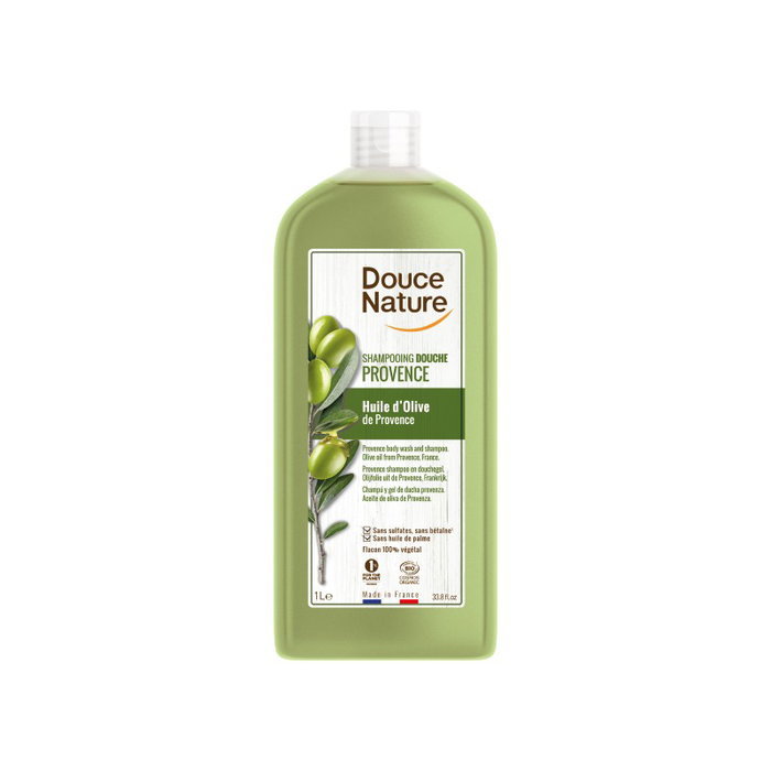 Champú gel para la higiene del cuerpo y cabello Al aceite de oliva de la Provenza, reconocido por sus propiedades nutritivas Sin sulfatos Sin jabón Envase 100% vegetal, reciclable, a base de caña de azúcar