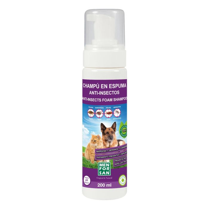 Men For San Champú en Espuma Anti-Insectos 200 mL con Margosa, Geraniol y Lavandino para Perros y Gatos