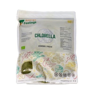 Indicaciones: La Chlorella Energy Feelings es de pared celular rota (una vez recolectada, la dura pared celular de ésta debe romperse para facilitar la digestibilidad del alga) Una vez rota la pared celular, las algas unicelulares son pulverizadas. Porducto vegano, sin gluten.