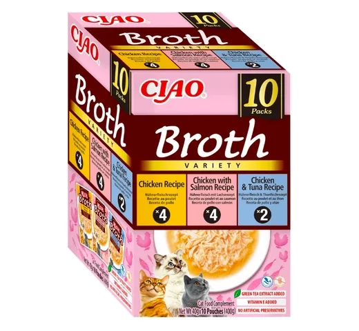 Disfruta del irresistible sabor y la nutrición de alta calidad con el Churu Ciao Broth Multipack de 10 unidades. Cada sobre contiene 40 gramos de delicioso alimento líquido suplementario para gatos, presentado en una práctica variedad de sabores que incluyen pollo, salmón y atún. Este multipack de la reconocida marca Churu está especialmente formulado para proporcionar a tu felino una experiencia de hidratación y sabor excepcional, ideal como premio, complemento a su dieta habitual o para animar a gatos con poco apetito. Su textura suave y aromática es muy atractiva para la mayoría de los gatos.