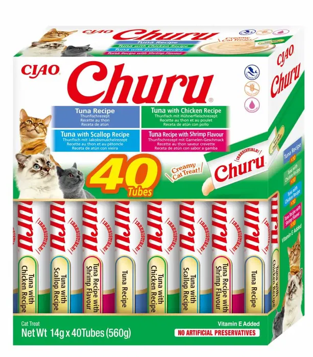 Churu Cat presenta sus deliciosos premios para gatos en forma de cremosa pasta húmeda. Este paquete contiene 40 unidades de 14 gramos cada una, ofreciendo una combinación irresistible de atún y marisco que encantará a tu mascota.