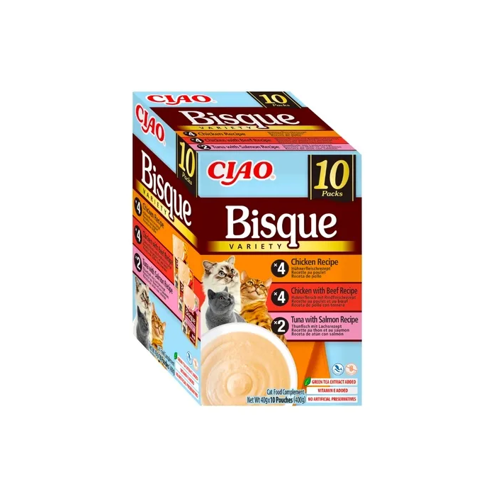 Disfruta de la irresistible variedad de sabores de la Bisque Multip de Churu Ciao. Este lote contiene 10 prácticos sobres individuales de 40 gramos cada uno, llenos de una deliciosa y suave textura tipo bisque (puré) que deleitará a tu mascota.
