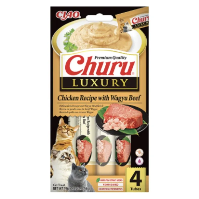 Descubre la experiencia gourmet para tu gato con Churu Luxury. Nuestra exclusiva receta combina el tierno pollo con el exquisito sabor del wagyu, ofreciendo un manjar irresistible que tu felino amará. Elaborado con ingredientes de alta calidad, este snack es la forma perfecta de consentir a tu mascota con un bocado sofisticado y nutritivo.