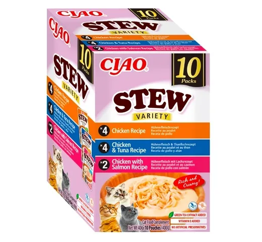 Churu Ciao Stew Multipack Pollo Atún Salmón 10x40 gr. Delicioso y cremoso alimento complementario húmedo para gatos en un práctico formato multipack. Cada pack contiene 10 unidades individuales de 40 gramos, ofreciendo variedad y nutrición con los sabores Pollo, Atún y Salmón. Ideal para premiar, mimar o reforzar el vínculo con tu mascota. La fórmula Ciao Stew es altamente palatable y fácil de servir.