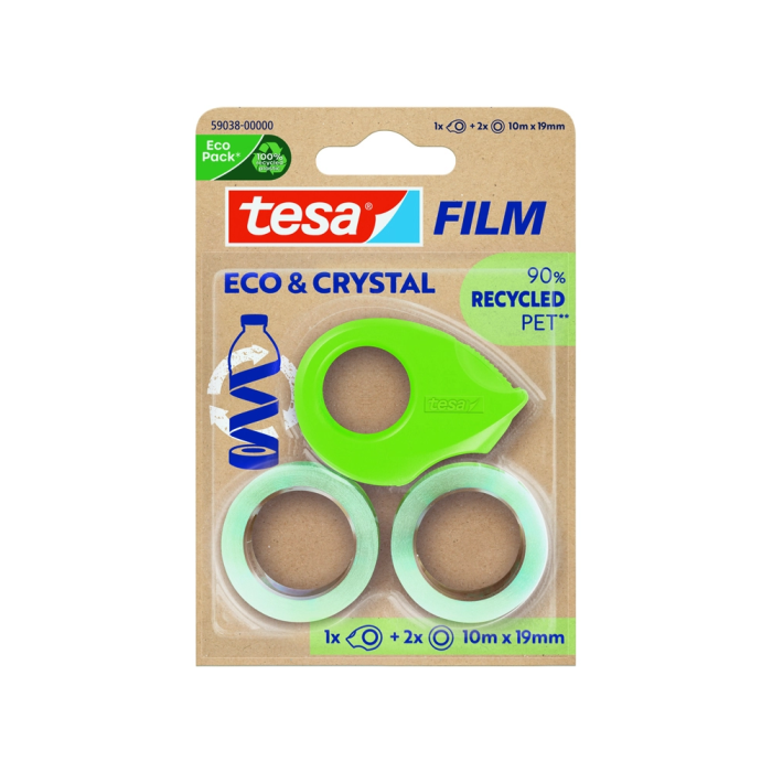 Tesa eco&cristal Cinta Adhesiva Transparente 10 mt x 19 mm Blister 2 Unidades + Miniportarrollo
