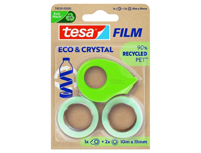 La cinta Tesa Film Eco&Amp Crystal ofrece un potente rendimiento adhesivo y además es completamente transparente. Cinta tesa de alta calidad con un proceso de fabricación innovador. Viene junto con un minidispensador de cinta fabricado al 100 % con plástico reciclado (carcasa). El soporte de la cinta adhesiva está fabricado en un 90 % de botellas de PET recicladas, certificadas por UL 2809 (ECVP). El núcleo del rollo está compuesto al 100 %por plástico reciclado. Esta cinta adhesiva resistente al desgarro es muy duradera y fácil de aplicar con el minidispensador incluido. Además, la c inta adhesiva se desenrolla silenciosamente, lo que hace que usar esta cinta sea una experiencia perfecta. El adhesivo en sí no contiene disolventestes y es acrílico a base de agua. Para mayor comodidad, los rollos están diseñados para ser compatibles con todos los demás dispensadores Tesa Film.Esta cinta tan versátil tiene multitud de aplicaciones, como el pegado, e , la fijación, la decoración y los tra