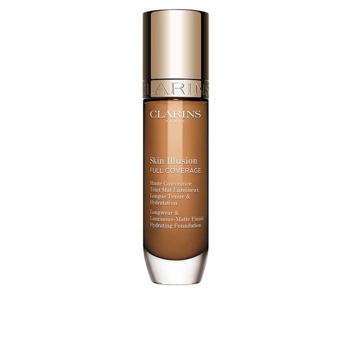 La base de maquillaje Skin Illusion Full Coverage de la marca Clarins proporciona una cobertura excepcional y se ha formulado para durar hasta 24 horas, todo mientras ofrece una textura ligera y cómoda. Su revolucionaria tecnología, conocida como Skin Fit Technology, permite que se adapte perfectamente a los movimientos naturales de la piel, resultando en un acabado uniforme, suave y radiante, sin exceso de brillos.