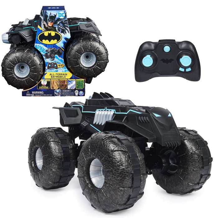 Sin miedo al agua, el coche Batman todoterreno 4x4 tiene un diseño resistente al agua y neumáticos de rendimiento superior, por lo que se desenvuelve sobre el agua con la misma facilidad que sobre la tierra. El coche radiocontrol 4x4 Batmobile en escala 1:15 con control remoto persigue a los supervillanos sobre cualquier tipo de terreno. Agua, nieve, barro, piedras, césped...