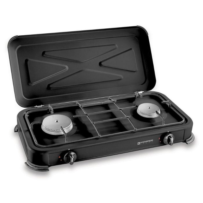 Kemper Cocina de Gas Butano/Propano 2 Quemadores, 1.4/1.2 kW, Negra Esmaltada con Tapa y Parrilla Extraíble, 570 x 300 x 65 mm