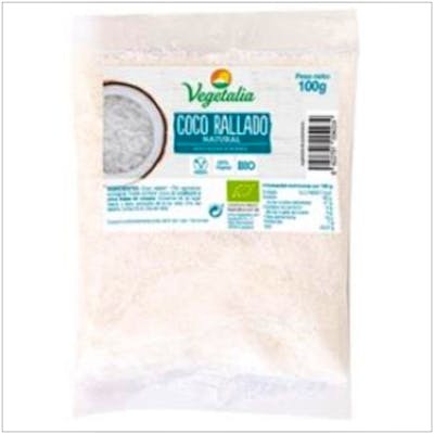 Composicion: Coco deshidratado* Valor nutricional por 100 g: Valor energético:2984KJ/723Kcal Grasas:63 g - de las cuales saturadas:55 g Hidratos de carbono:24 g - de los cuales azúcares:7.3 g Fibras:16 g Proteínas:6.9 g Sal:0.03 g (*)= De agricultura ecológica. + Puede contener trazas de cacahuete y otros frutos de cáscara.