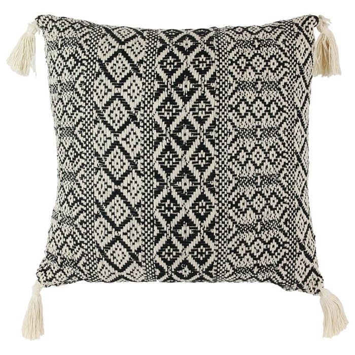 - Mejore el estilo de su hogar con este cojín de inspiración étnica, con estampado en blanco y negro y con una borla en cada extremo.